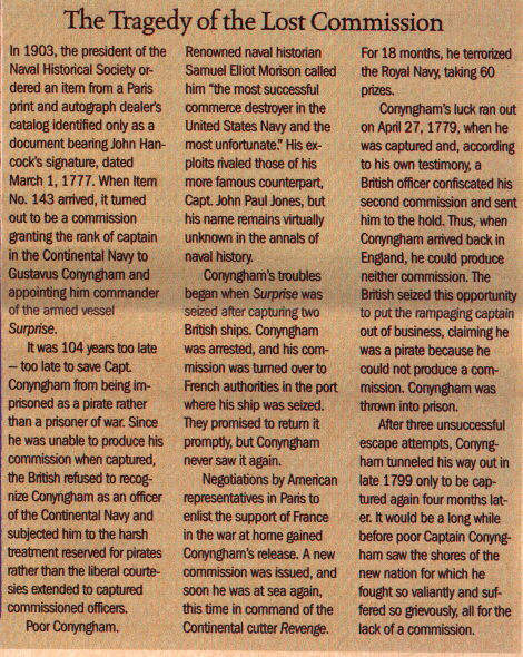 Gustavus Conyngham was born in County Dengal, Ireland 1744. He immigrated to the United States (Colonies) with his father a few years before the Revolutionary War and resided in Philadelphia, Pennsylvania. In 1777, the merchant ship he commanded, CHARMING PEGGY, was seized and interned in Europe. He then sought and obtained a Captain's Commission in the Continental Navy. Operating primarily in British waters, Captain Conyngham proved to be one of the most successful and audacious naval officers in the American Revolution.His first naval command was the 100-ton cutter SURPRISE whose mission was attacking British shipping in the English Channel. After taking numerous prizes, he was given command of the cutter REVENGE which was larger and faster than SURPRISE. He continued to harass British shipping, taking more than 60 prizes in 18 months. Each ship captured was sent into a friendly port and the cargo disposed of in the interest of the revolutionary cause. Historians indicate that the proceeds from these prizes contributed materially to the operations of Benjamin Franklin and his American mission in France. British influence finally forced the closure of French and Spanish ports to him, so he set sail for the West Indies where he convoyed American shipping in addition to continuing his task of capturing enemy merchant ships. In 1779, Captain Conyngham returned to Philadelphia, but on his next cruise he was captured and taken prisoner as a privateer. He was interned first in New York and then in London, from where he escaped only to be recaptured while returning to America in 1780. Again, he escaped and was in France, preparing to cruise against the British, when the war ended. Captain Conyngham returned to the merchant service and commanded the armed brig MARIA during the Quasi-War with France. Later, as a member of the common council of Philadelphia, he assisted in the defense of the city during the War of 1812. Captain Conyngham died on 27 March, 1819 and is buried in St. Peter's Churchyard in Philadelphia. |